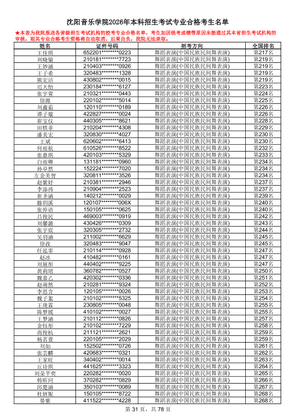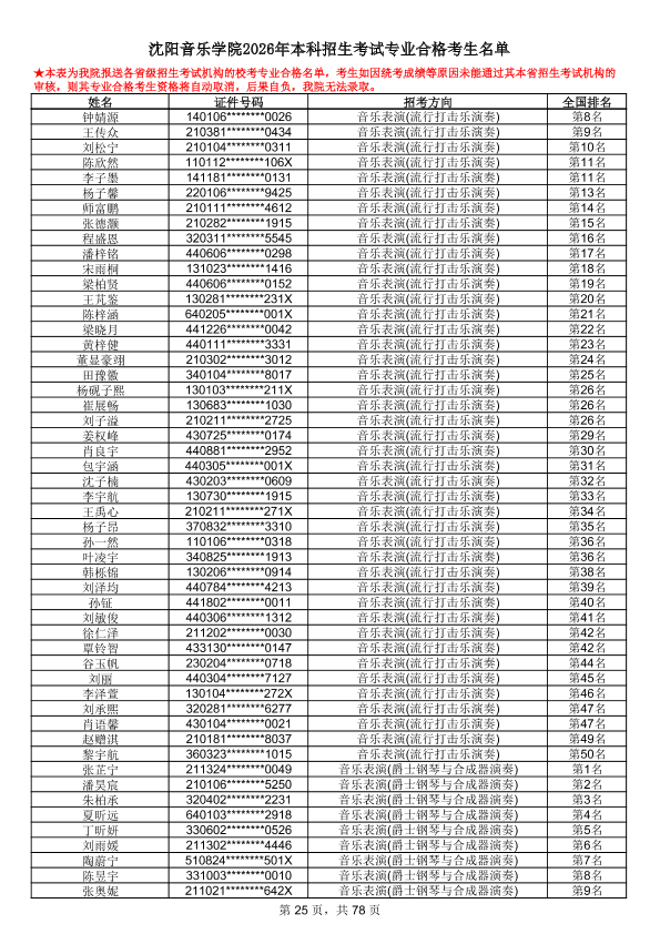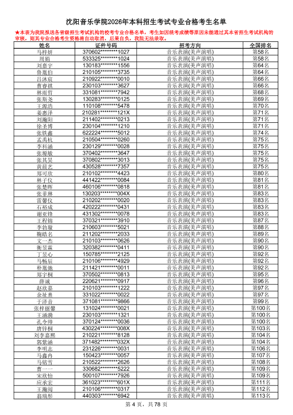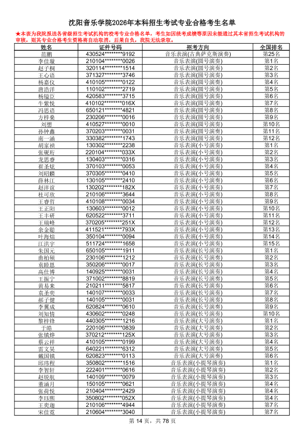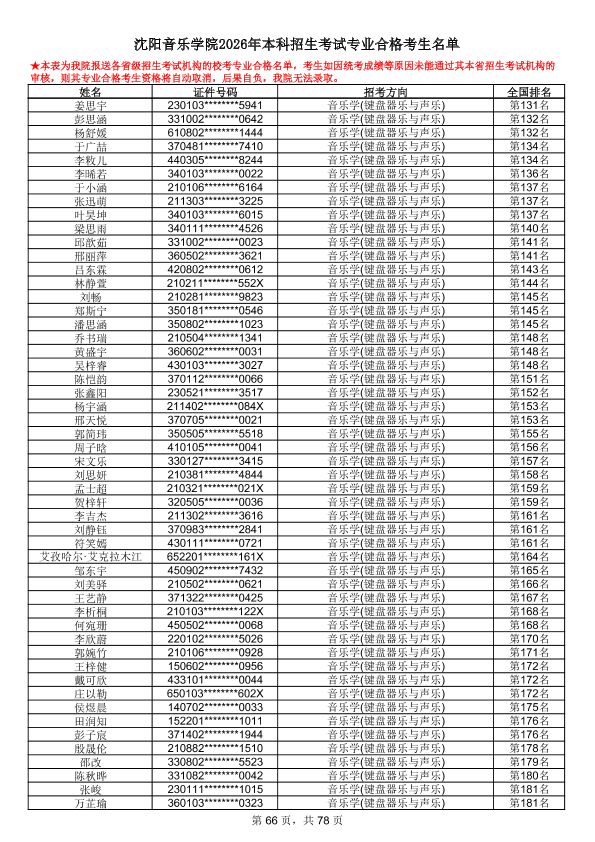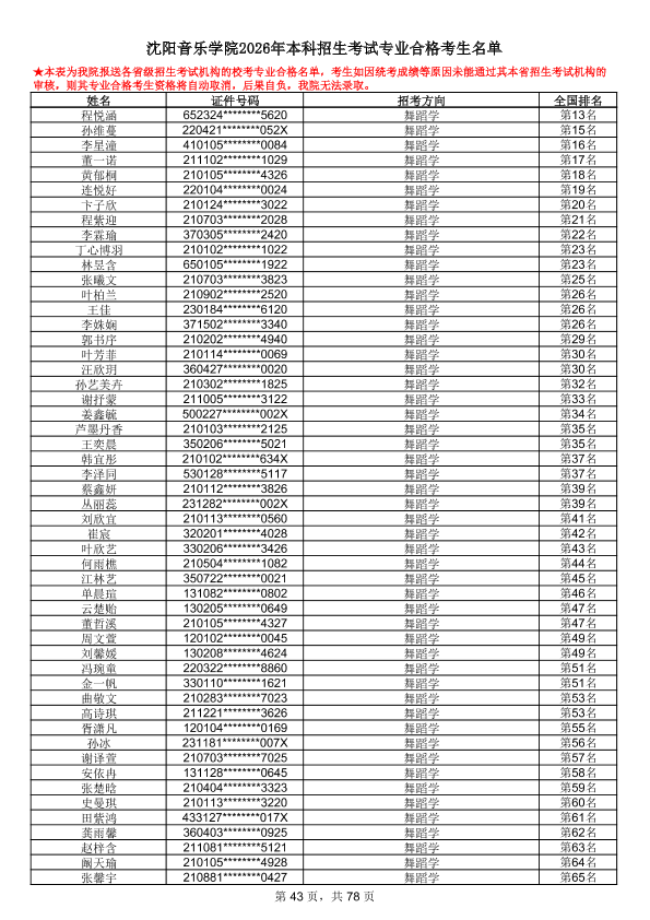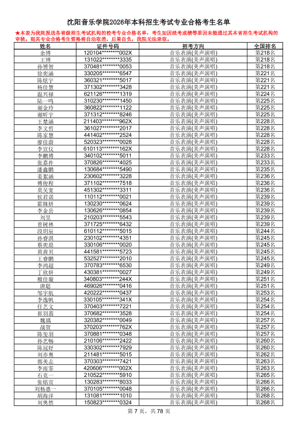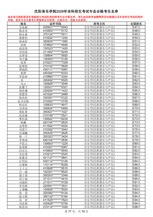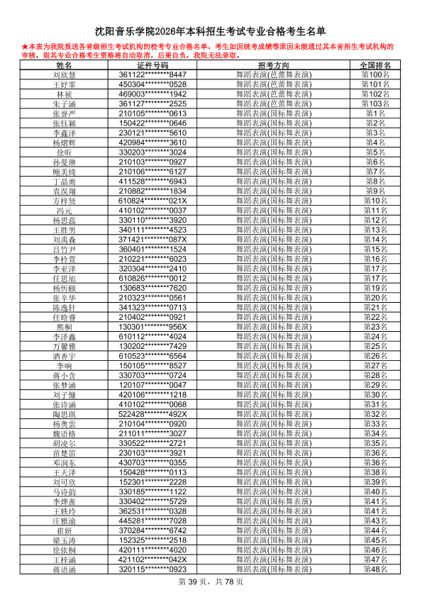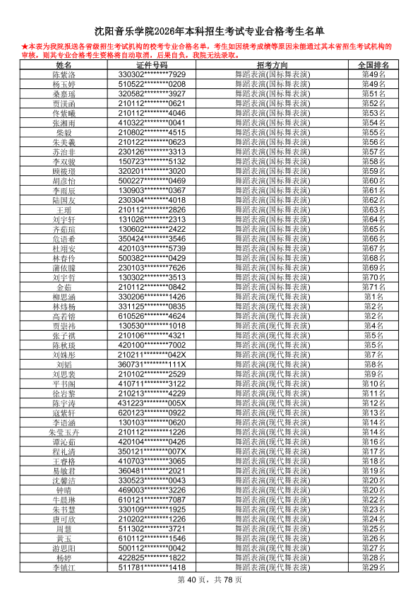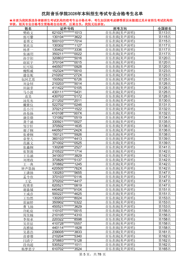 沈阳音乐学院2026年本科招生考试专业合格考生名单