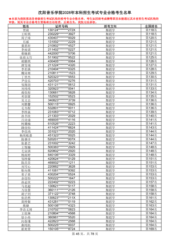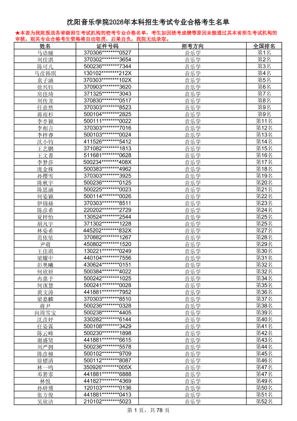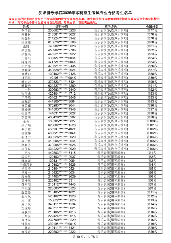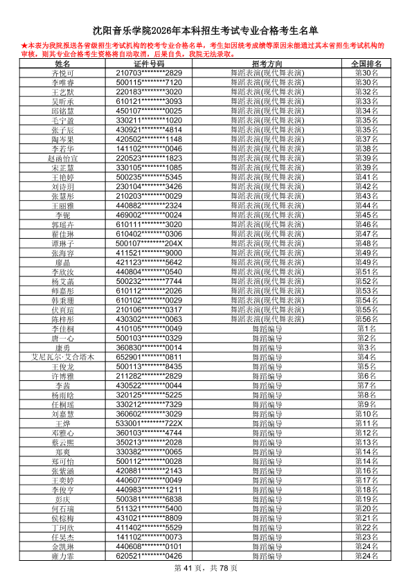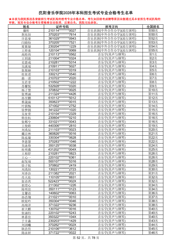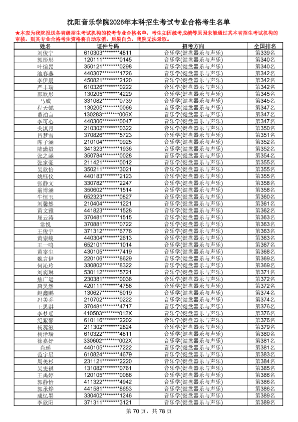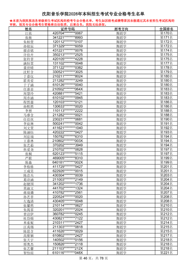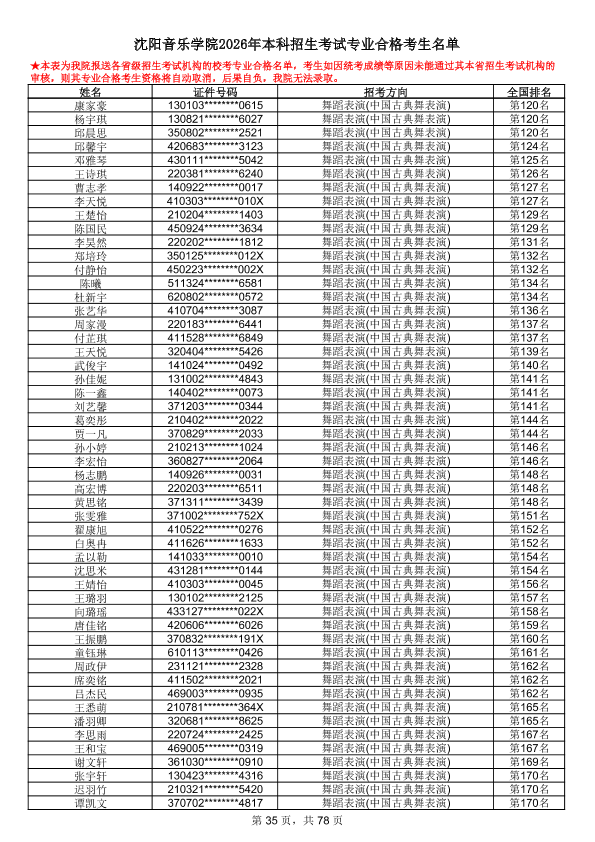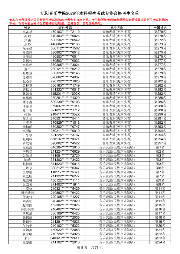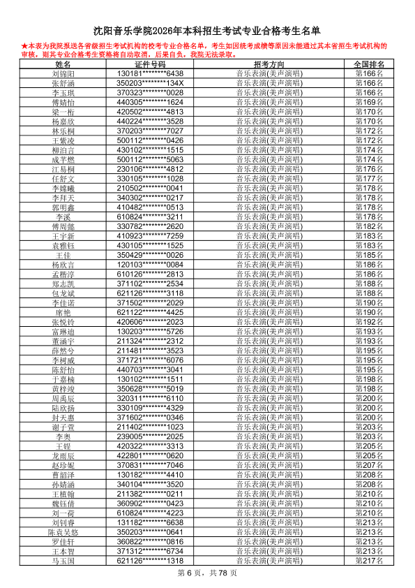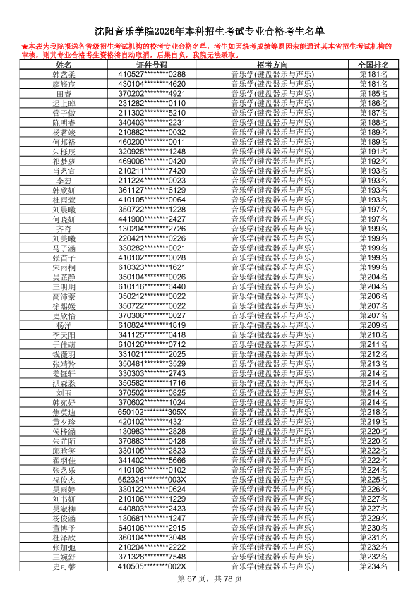 沈阳音乐学院2026年本科招生考试专业合格考生名单