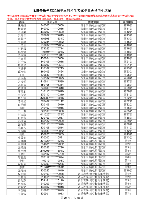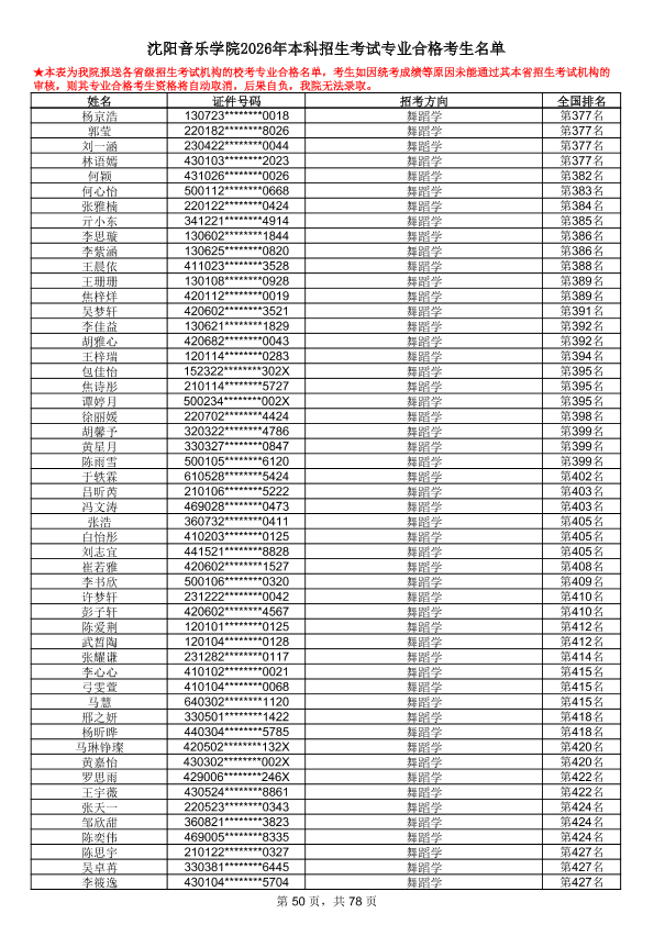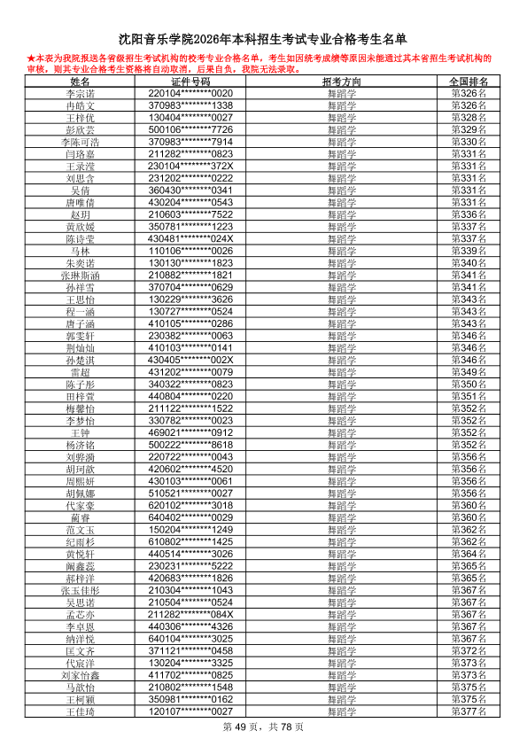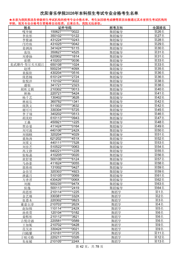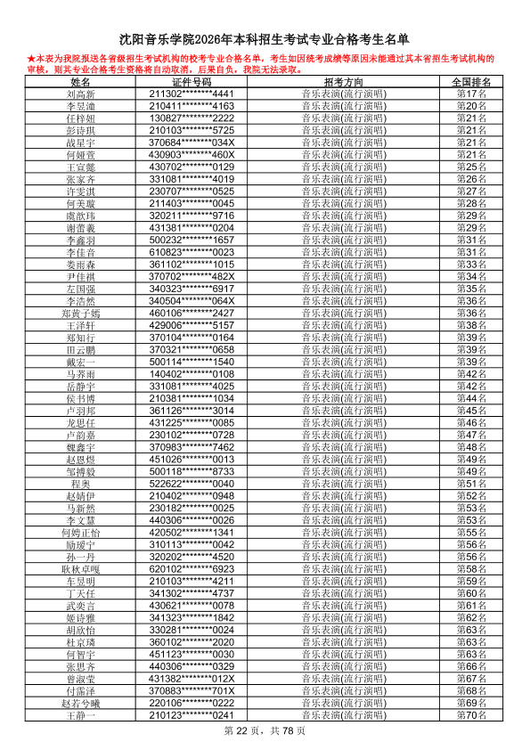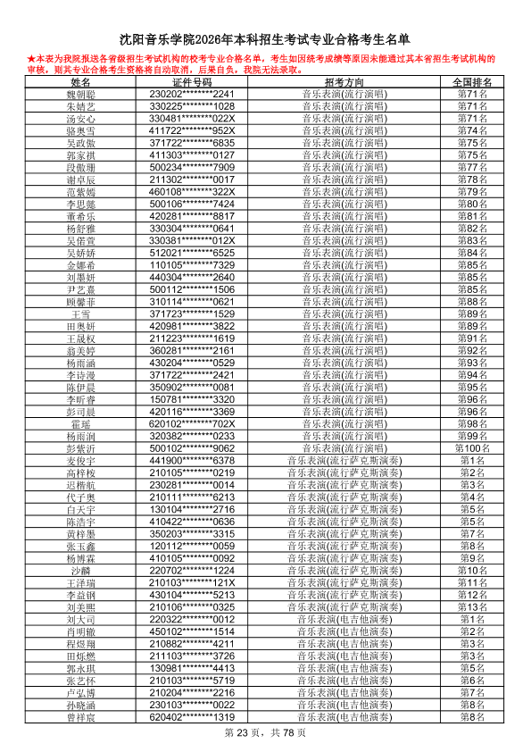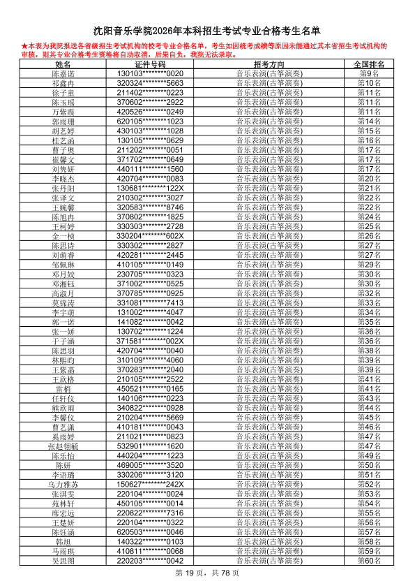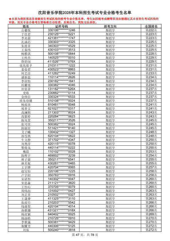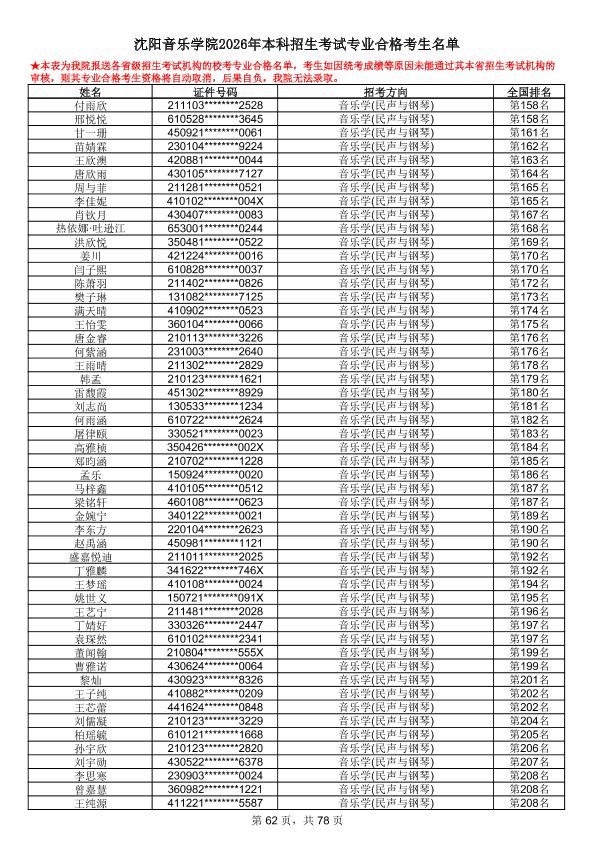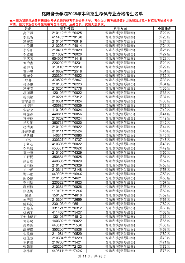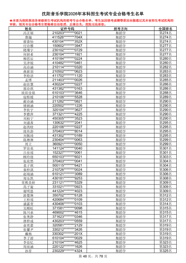 沈阳音乐学院2026年本科招生考试专业合格考生名单
